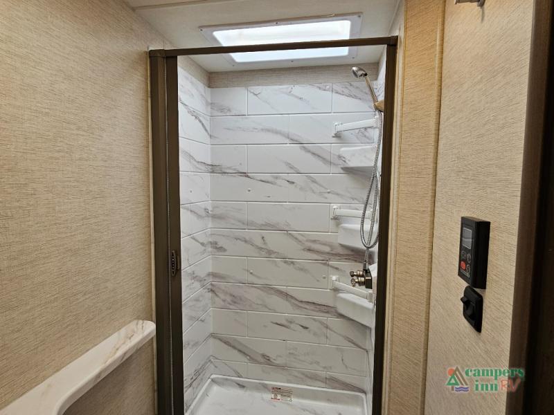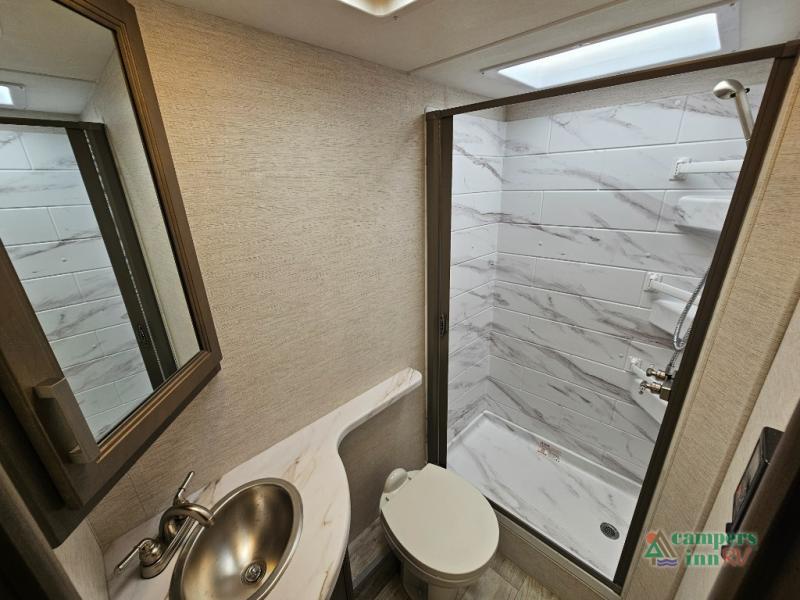 Rear corner bathroom with step-in shower and skylight for added light and headroom