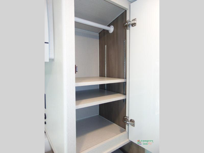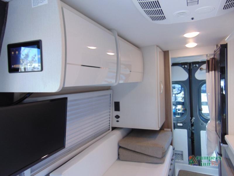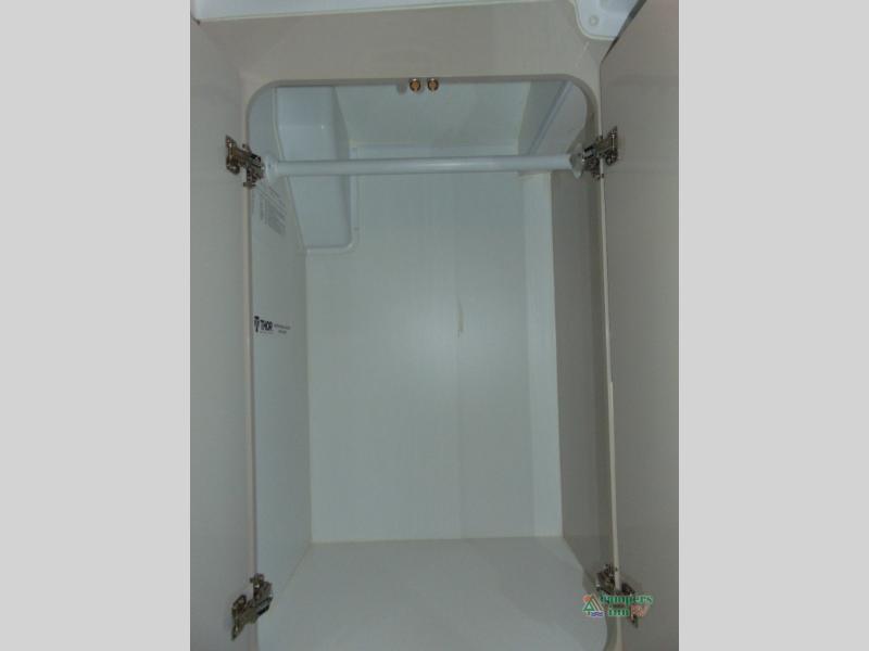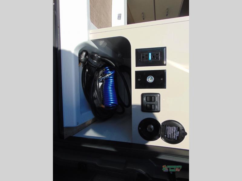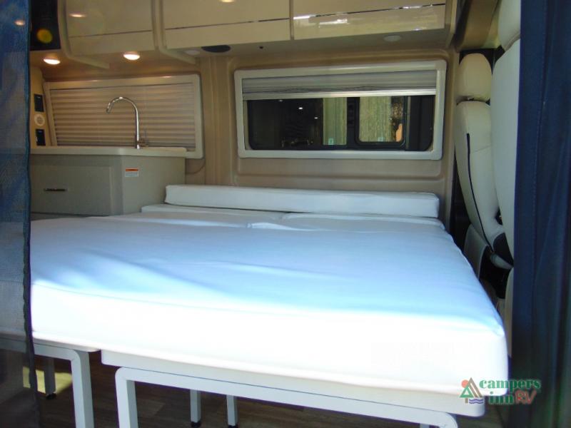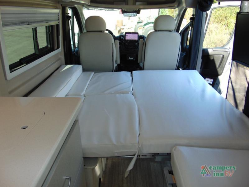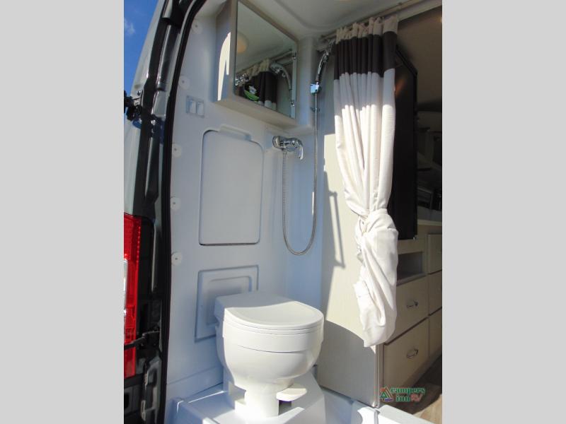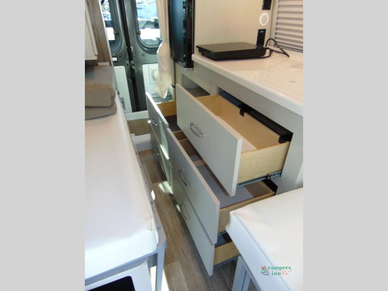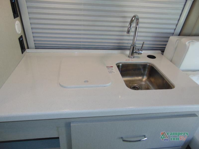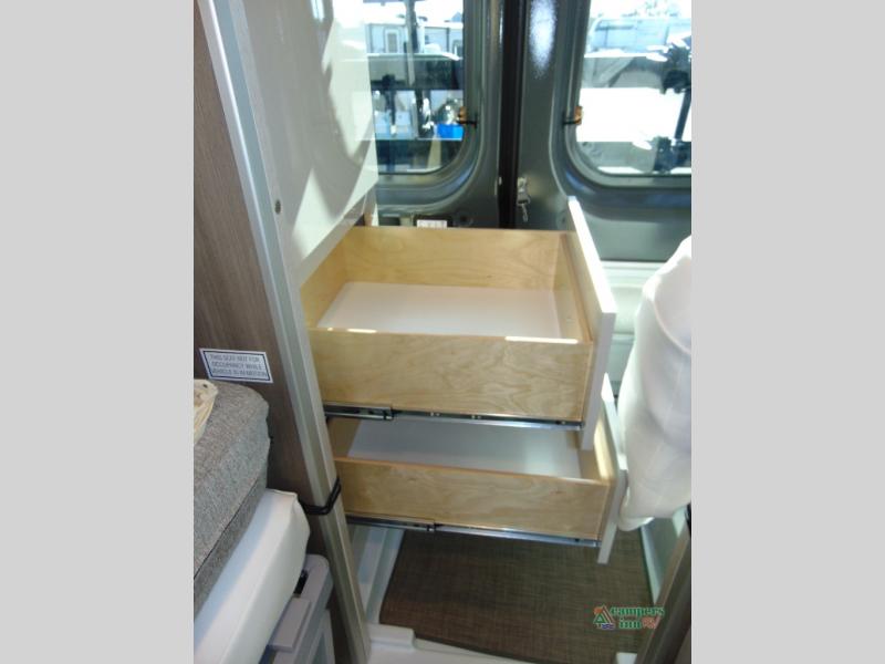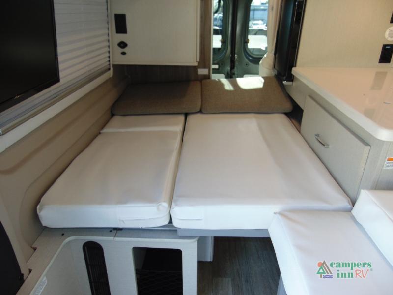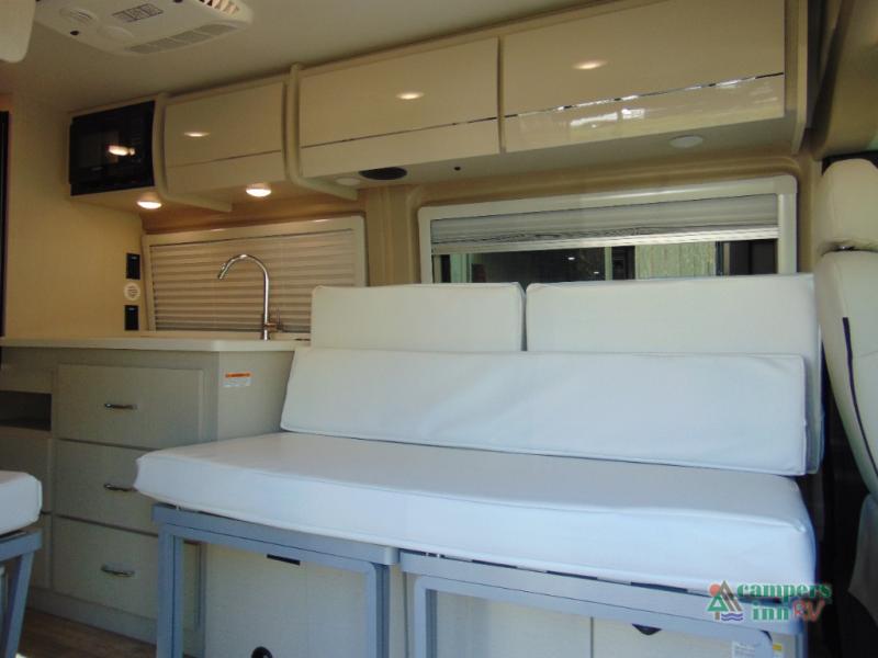 Hit the open road in this coach that can sleep two to three each night. You will love relaxing on the expanding sleeper sofa with a portable table, plus there is a pull-out bench that converts to a 60" x 51" sleeping space for an extra guest. A single burner induction cooktop and microwave oven lets you cook meals each day, and the single door 12V refrigerator will be perfect for cold items. You'll find the rear wet bath convenient to freshen up before bed, plus there is a wardrobe and drawers here for clean towels and toiletries!