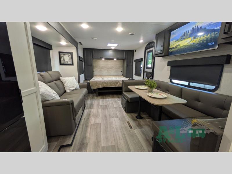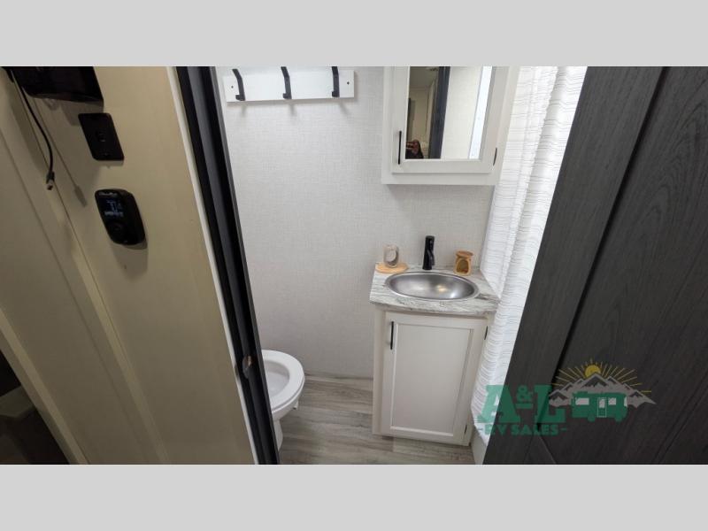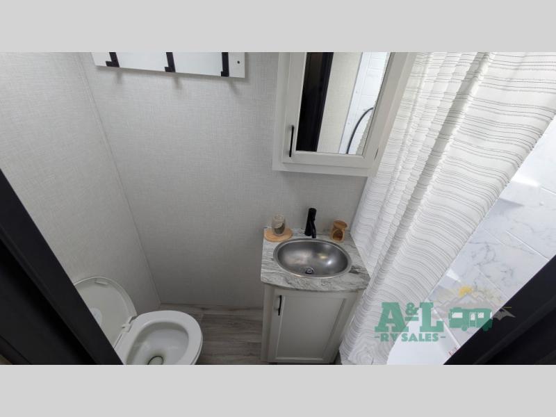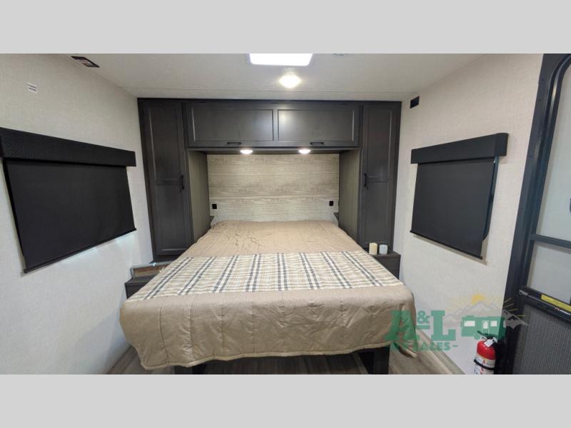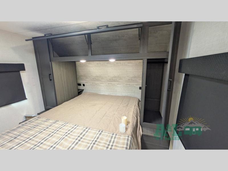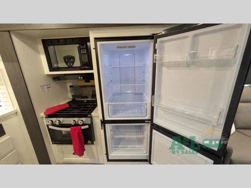 You and your spouse will have a good time at the campground in this travel trailer! The front sleep tight queen bed has shelves and overhead cabinets to keep your items close by but out of the way. Grab some eggs from the 10 cu. ft. refrigerator to fry them up on the three burner cooktop then enjoy them at the 88" x 42" U-shaped dinette which has an entertainment center above it. After a fun, long day at the beach you can freshen up in the rear corner bathroom in the 30" x 36" shower then relax on the theater seating with USB ports and cupholders!