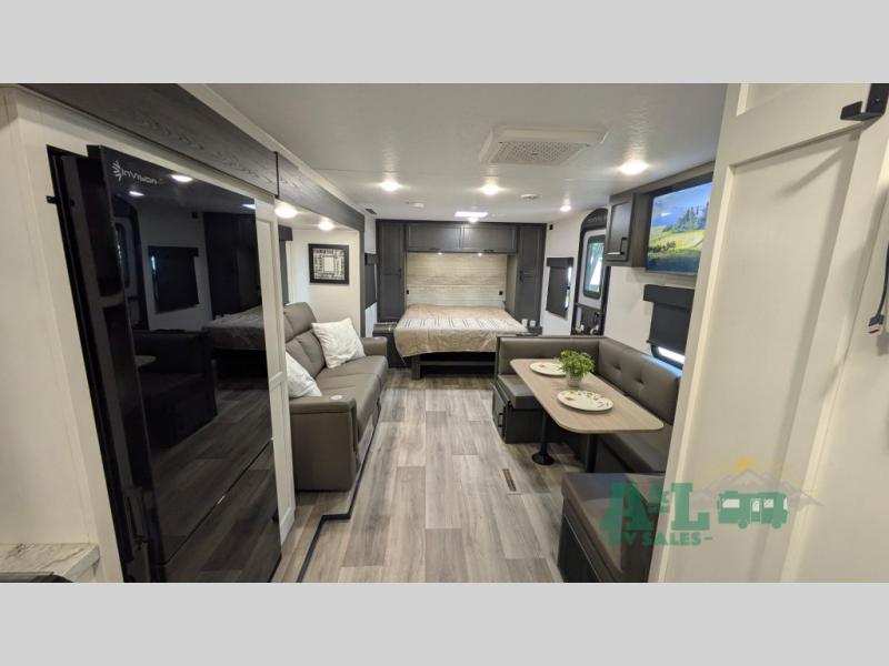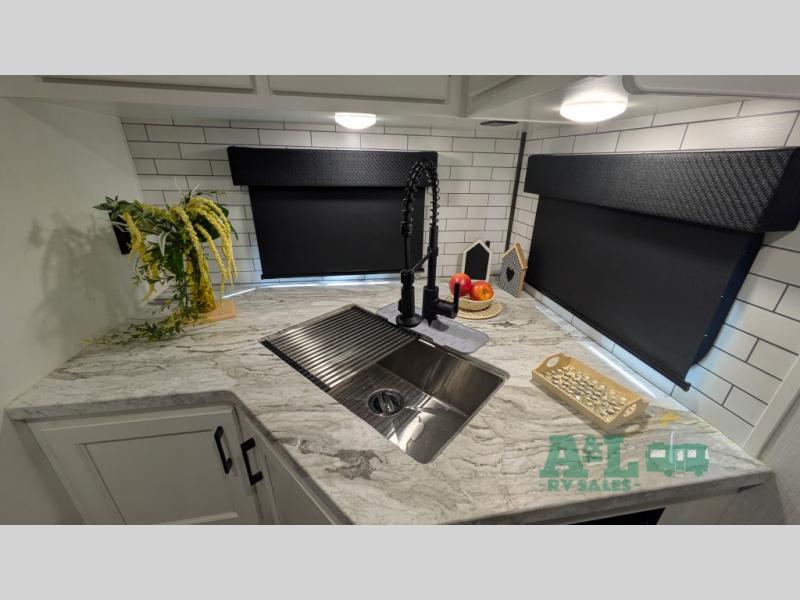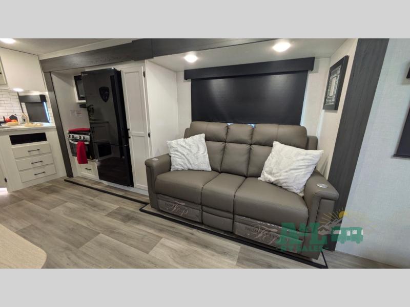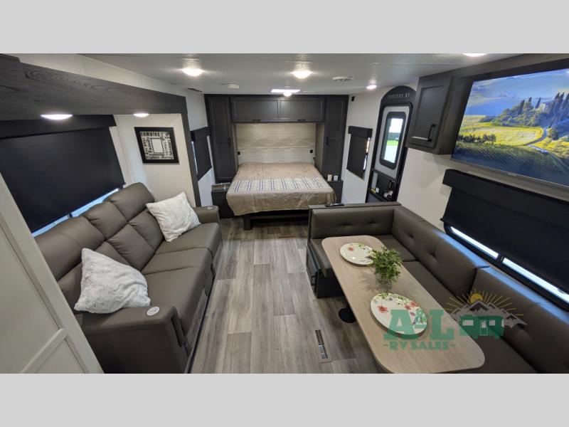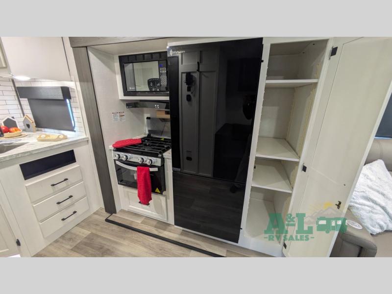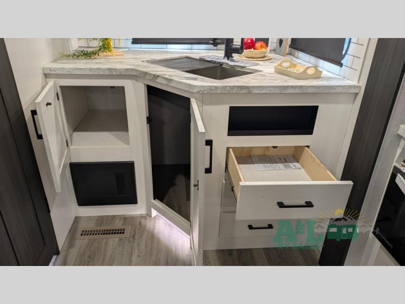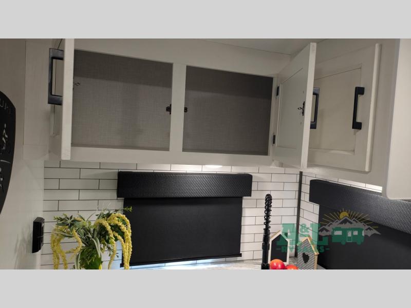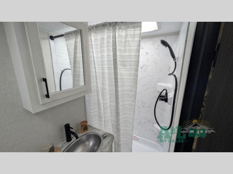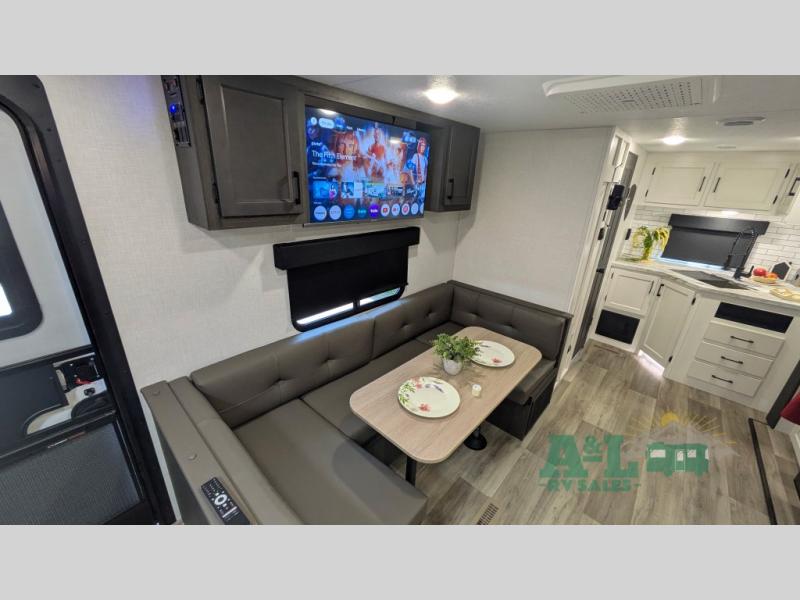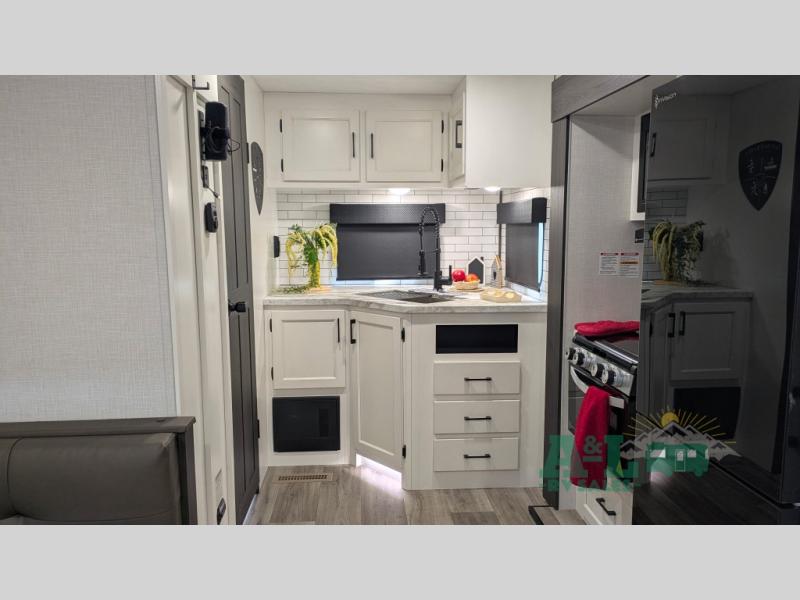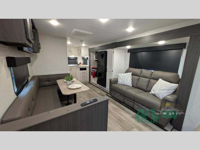 You and your spouse will have a good time at the campground in this travel trailer! The front sleep tight queen bed has shelves and overhead cabinets to keep your items close by but out of the way. Grab some eggs from the 10 cu. ft. refrigerator to fry them up on the three burner cooktop then enjoy them at the 88" x 42" U-shaped dinette which has an entertainment center above it. After a fun, long day at the beach you can freshen up in the rear corner bathroom in the 30" x 36" shower then relax on the theater seating with USB ports and cupholders!