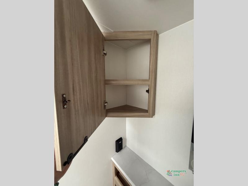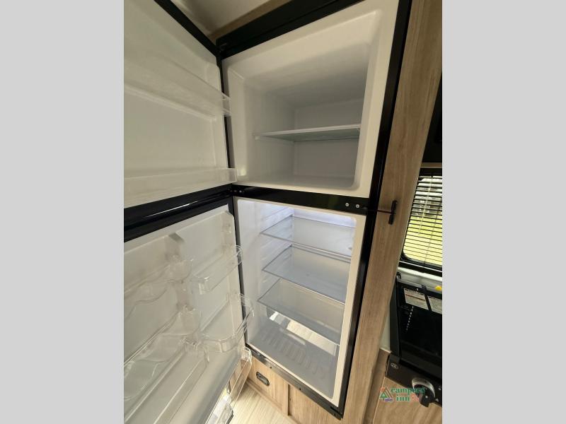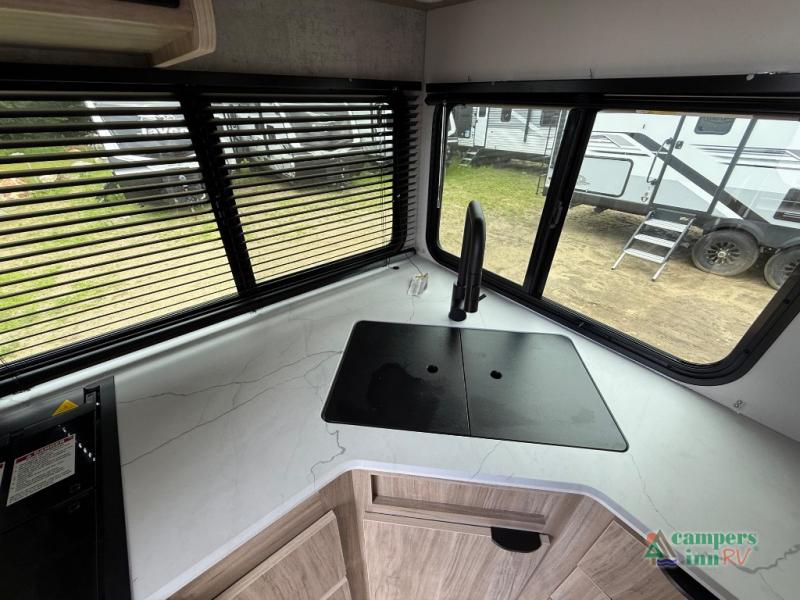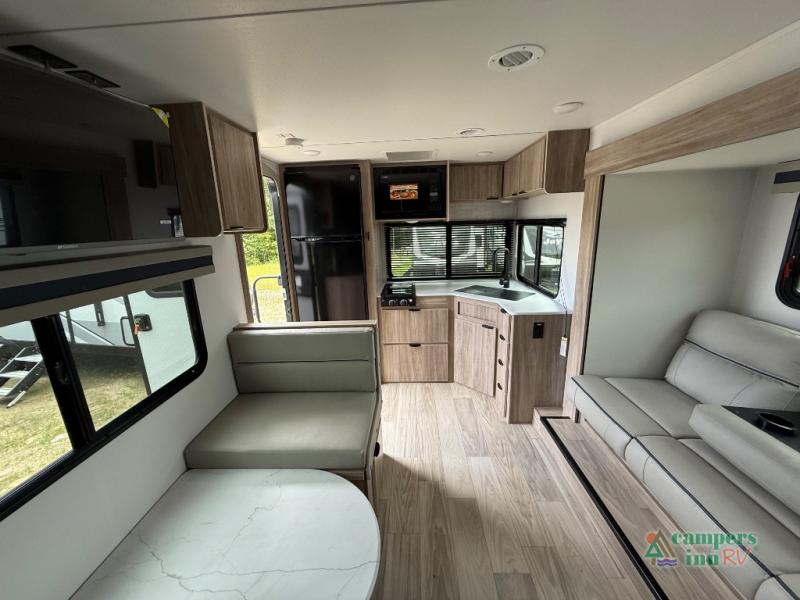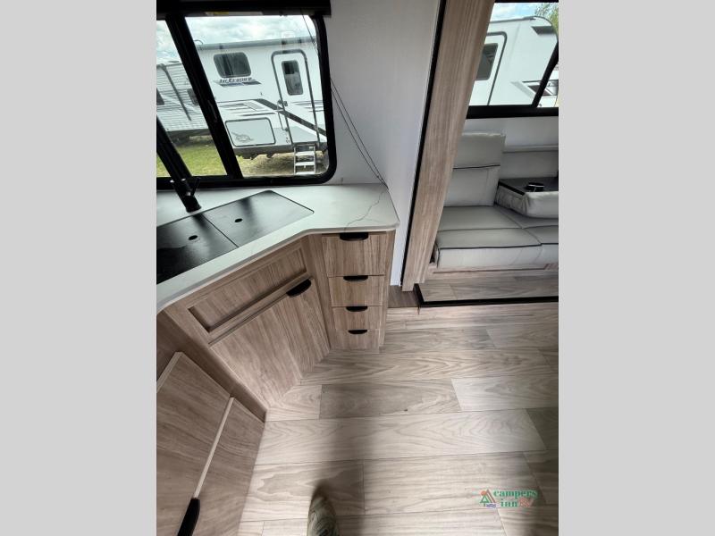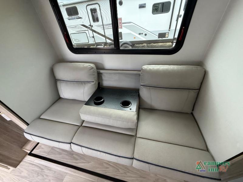 If you are looking for a rear kitchen layout, then this M-Series trailer might be perfect for you! Enter and find the kitchen right there making loading groceries a cinch with the 10 cu. ft. RV refrigerator just inside the door. There are dual windows near the corner sink which is great when washing dishes allowing you a nice view of your surroundings. A 64" jack-knife sofa slide creates more space on the interior for moving around, and also functions as additional sleeping. Opposite the sofa, you will find a 32" x 76" booth dinette. Here is where you will find overhead cabinets and an optional TV if you choose to add. A walk-through bath offers plenty of space to get cleaned up and ready for another day since it stretches across the entire width of the trailer. Each morning or night you will enjoy the convenience of a 30" x 36" shower on one side, and a toilet and corner vanity with sink opposite. The vanity counter also stretches along the curbside wall for added space for your things. A sliding space saving door leads into the front private bedroom featuring a queen bed with dual bedside wardrobes for your clothing. There is a large overhead cabinet as well. On the outside, a pass-through compartment offers easy access for all of your outdoor gear and more!