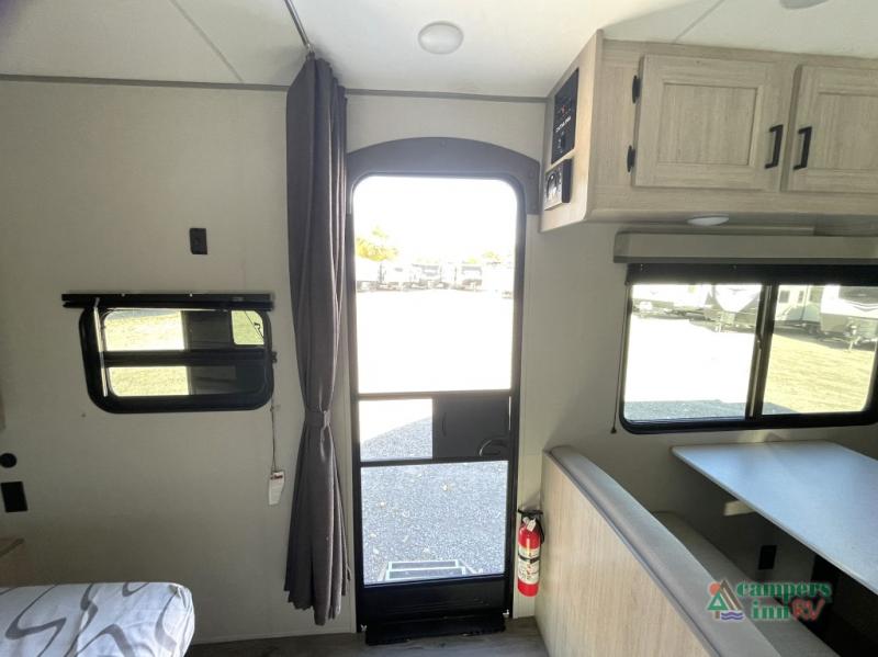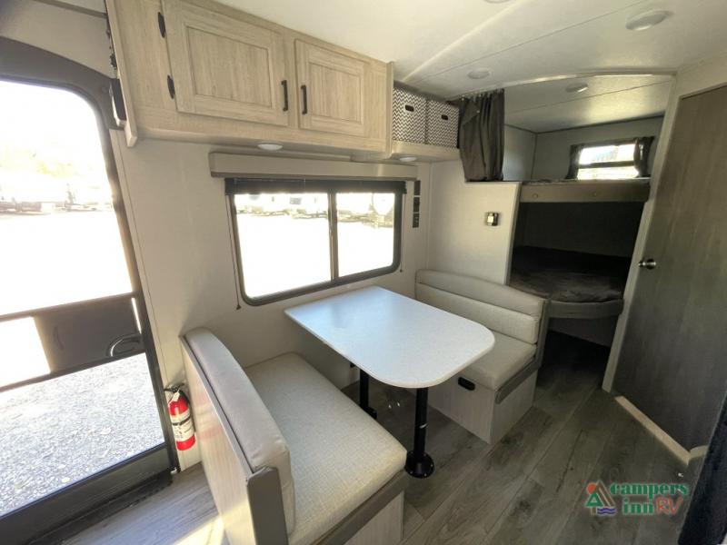 Booth Dinette: Gather for meals and games, or take your dining outdoors under the 15' Power Awning with Multicolored Lights for a magical atmosphere.